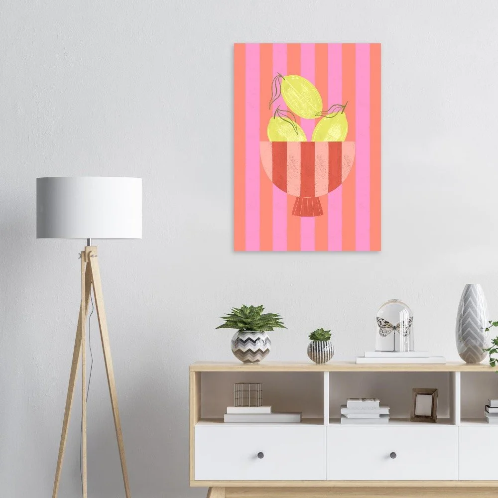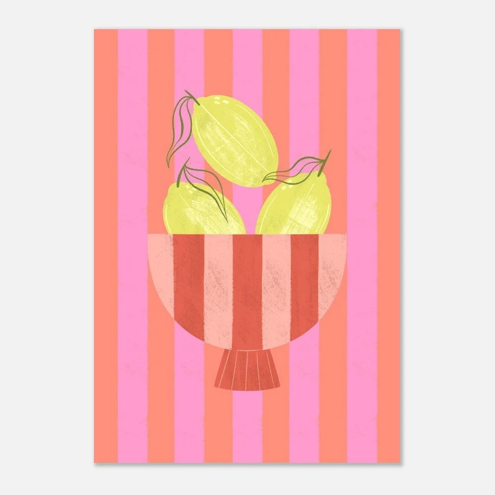 Elevate your space with Lemons in Bowl Art Print. Featuring vibrant lemons against a striking striped backdrop, this artwork adds a touch of elegance to any room. Printed on luxurious, heavyweight 200 gsm matte paper with a smooth, non-reflective finish, it offers a premium feel. Available in sizes A4, A3, A2, and A1, it's perfect for any wall space. All prints are sustainably sourced (FSC-certified paper) and printed on demand. Fulfilled in the UK, shipping is available worldwide.