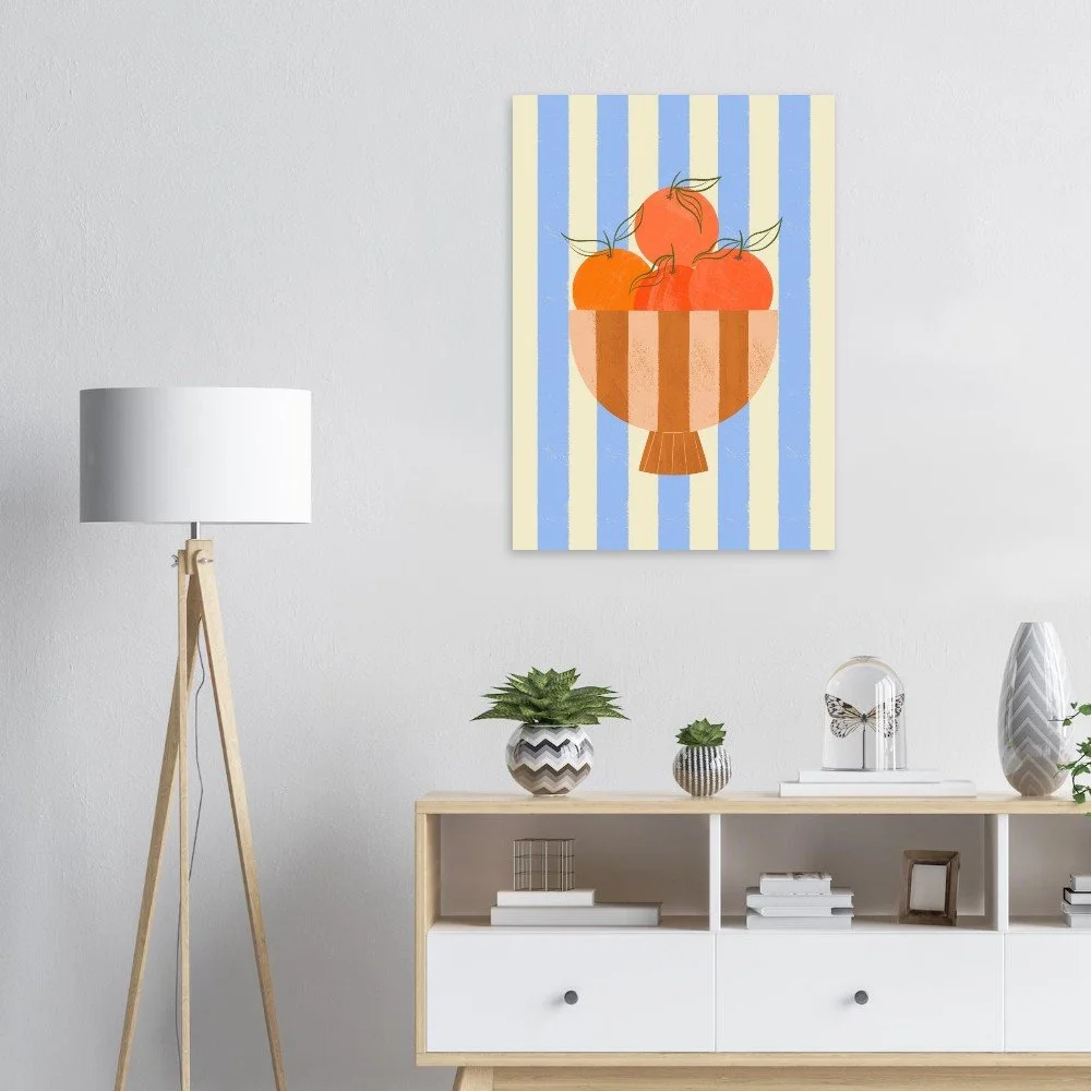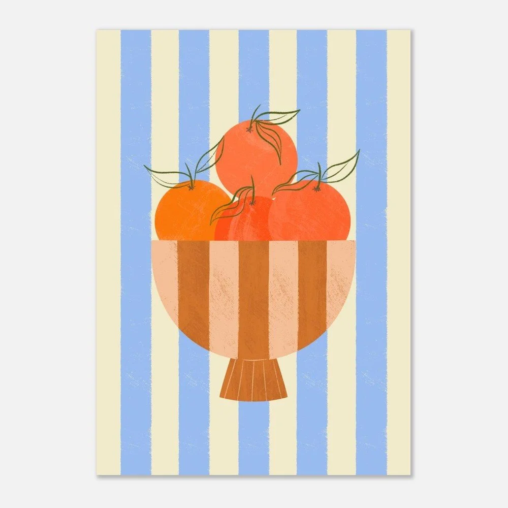 Elevate your space with Les Oranges Art Print. Featuring vibrant oranges against a delicate blue striped backdrop, this artwork adds a touch of elegance to any room. Printed on luxurious, heavyweight 200 gsm matte paper with a smooth, non-reflective finish, it offers a premium feel. Available in sizes A4, A3, A2, and A1, it's perfect for any wall space. Prints are sustainably sourced (FSC-certified paper) and printed on demand. Fulfilled in the UK, shipping is available worldwide.