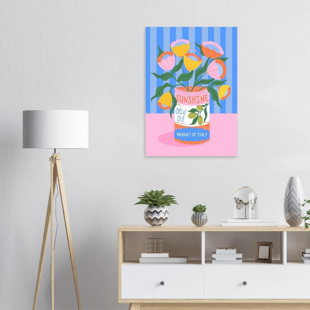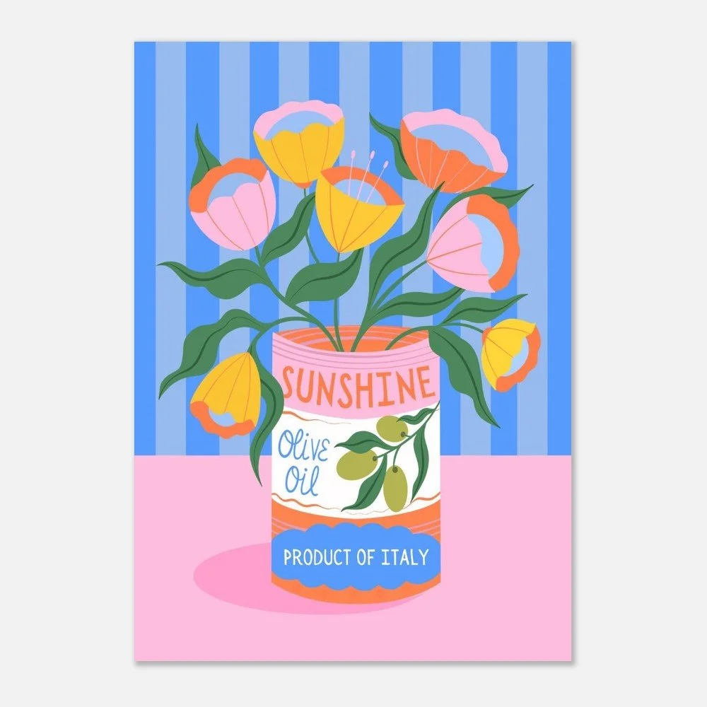Elevate your space with this Olive Oil Art Print. Featuring vibrant florals in a vintage style food packaging tin.