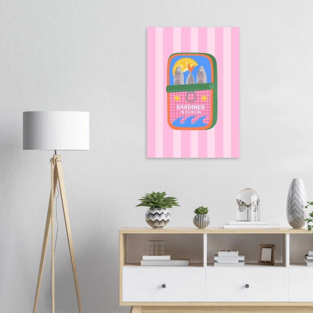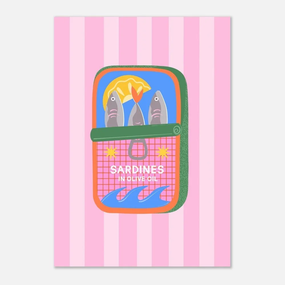 Elevate your space with this Sardines Art Print. Featuring a vibrant tin of sardines on a modern striped pink background.